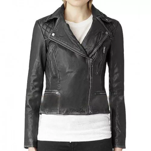 - This Skye Jacket is black in color and has a base of leather; the leather may be in either real or faux option with a glossy finish and intricate stitching.