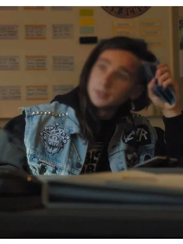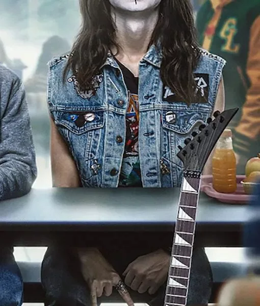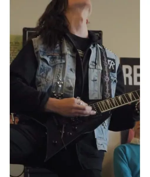 Have an impressive and fierce look wearing Hunter Sylvester Metal Lords Vest that is showcased is Metal Lord 2022, a comedy drama film that got fame on Netflix due to its incredible actors. Hunter Sylvester showed a brilliant performance in the movie and was seen wearing this vest and admired by a lot of people for her exclusive looks. It is crafted with the best quality denim to make this outfit classy and along with an internal viscose lining for a much more relaxed and warm feeling. The front side is designed finely using buttons and shirt style neck collar that perfectly fits any size. Two chest pockets and two front welt pockets are present, it has no sleeves that give out a vintage look. It is blue.