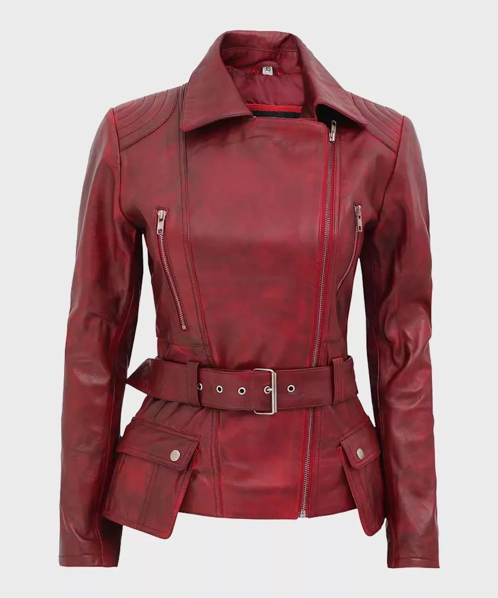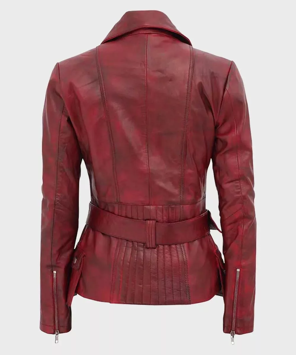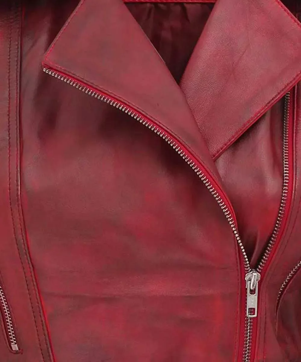 Distressed Motorcycle Maroon Leather Jacket for Women