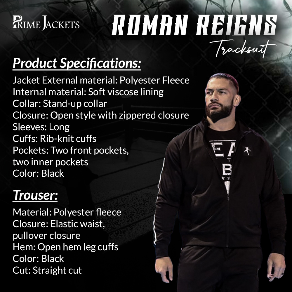 Make your tracking experience exciting enough with this Roman Reigns Tracksuit that is made up of a Polyester Fleece fabric that is great for tracksuits. To make you feel a bit comfortable we’ve added a soft viscose lining inside the jacket. It is designed finely with a stand-up style collar and an open style at the front with a zippered closure. The sleeves are long with rib-knitted cuffs. It also has two front pockets and two inner pockets.